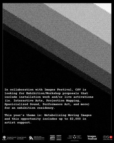 We’re currently looking for hybrid exhibitions that could include installation work and/or live performance (ie. Interactive Arts, Projection Mapping, Immersive Sound, Experimental Music, Performance Art, Experimental Dance, and more) installation at Charles Street Video held during the Images Film Festival.