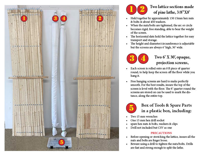- Two wood lattice frames form a circle or arc. Two sections of 3/8” X 8’ wood lathe lattice form free standing arcs or a full circle. The max diameter of full circle projection using CSV projectors is 16’.
