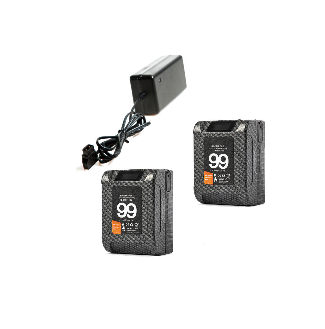 2 compact V-mount batteries with a charger.