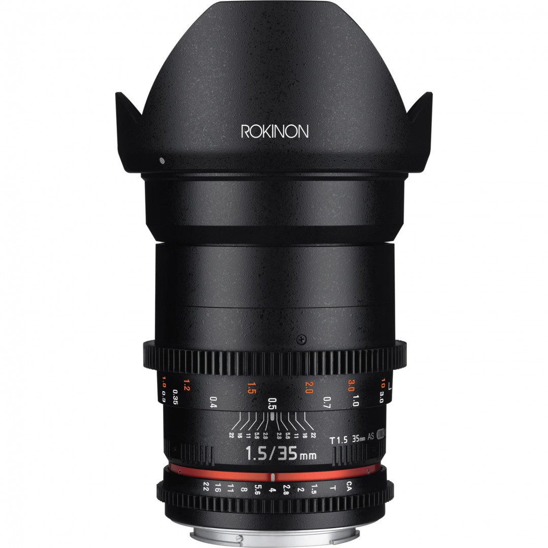 The Rokinon 35mm T1.5 VDSLR AS UMC II Lens was developed primarily for film and video applications. The cine version of Rokinon's 35mm lens features industry-standard gearing for the focus and aperture ring, and the aperture ring has been de-clicked for smooth iris pulls. The aperture and focus scales have also been relocated to the side of the lens, where it is easier for focus pullers to read them.
