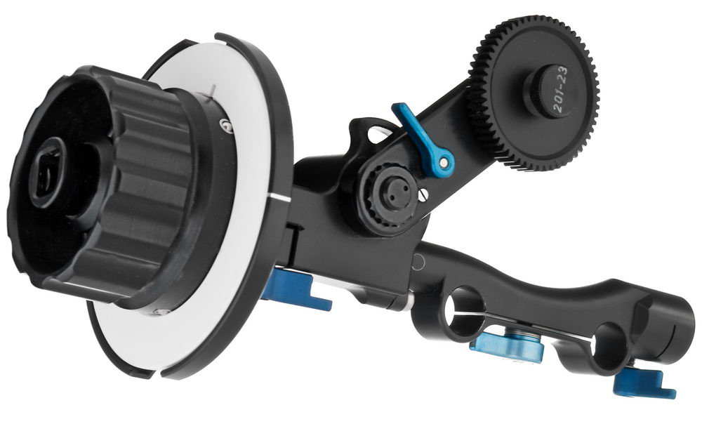Includes: 2 follow Focus disks (use white dry erase marker only) 1 Off-Side Focus Handle 1 12 inch whip 1 L-Shaped Crank 1 5/32 inch Allen Key 1 Adapter 15:19mm for rods 1 universal lens gear