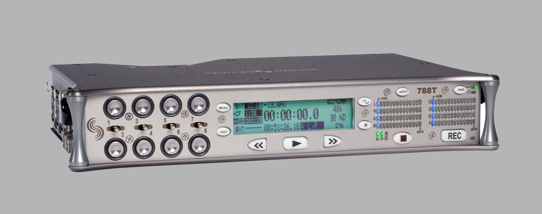 The 788T is an eight input, twelve-track digital audio recorders designed for production sound. Its eight pristine analog inputs accept microphone or line-level signals, provide 48 V phantom power, offer peak limiters for microphone signals, and adjustable high-pass filters. For additional flexibility, the 788T accommodates eight channels of balanced AES3 digital input and six channels of balanced analog line-level and AES3 digital output. Support for AES42 digital microphones is also available.