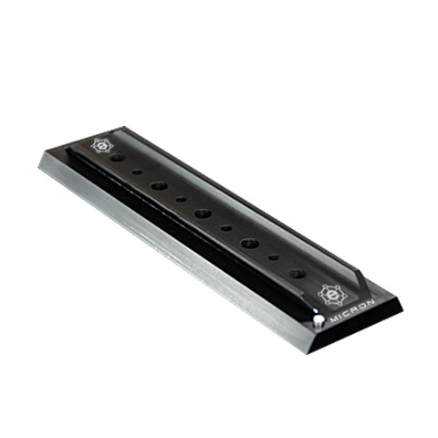 The Micron Dovetail comes with a linear spacing of alternating 1/4-20" and 3/8-16" threaded holes spaced at 38mm apart, with an overall length of 9" and also comes with safety buttons on both sides of the dovetail that allow for front and rear load of the Micron Bridge Plate mounted camera.