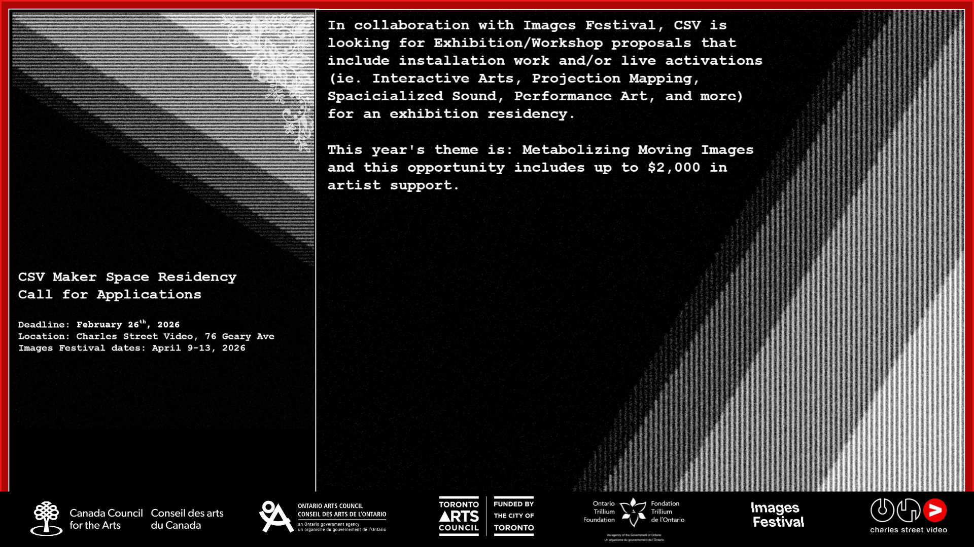 CSV also commissions artists to create new works, and sponsors a variety of youth-oriented production programs and post-secondary scholarships. We actively participate in local exhibitions of media art through our partnerships with arts organizations and grassroots festivals.